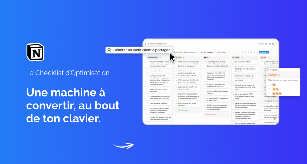 Le système ultime pour générer des audits, évaluer des landing pages et obtenir une roadmap priorisée des optimisations à réaliser.